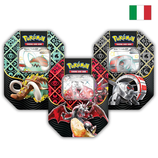 Con questa scatola da collezione puoi scegliere tra la forza tellurica di Grandizanne-ex in veste di Pokémon Tempo Passato, la tenacia da corazzata di Solcoferreo-ex in qualità di Pokémon Tempo Futuro o lo spirito infuocato di Charizard-ex come Pokémon Teracristal di tipo Oscurità.
